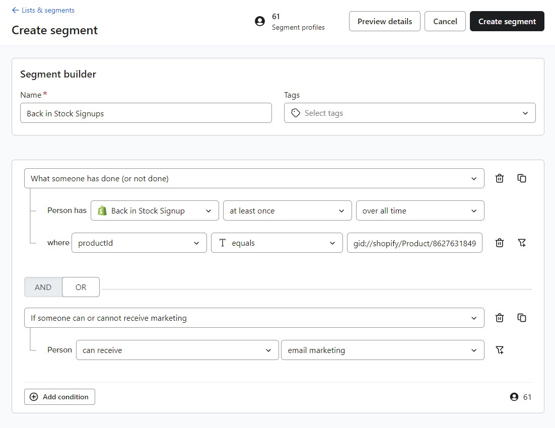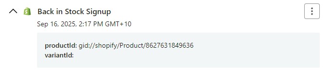 This will send the Product ID and Variant ID for the signed up product to Klaviyo, and can be used later to create dynamic segments for each product.