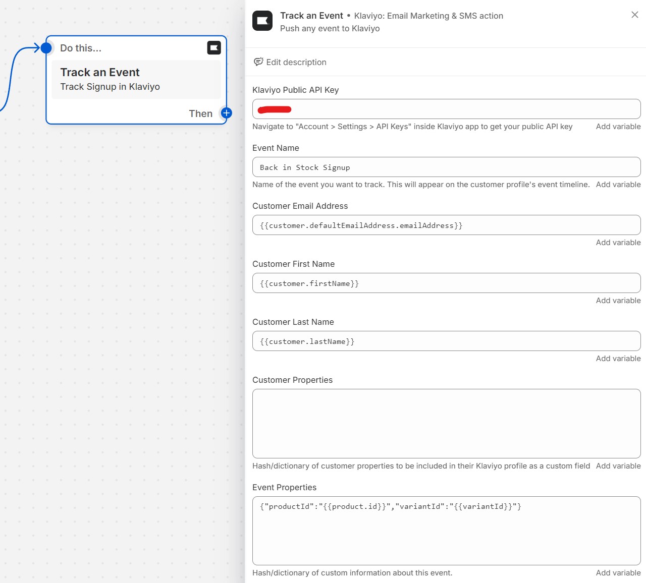 Fill in the form fields, including your Klaviyo Public API Key (can be found in your Klaviyo settings). Name your event however you'd like, and enter the following variables to pass through the relevant customer information:
