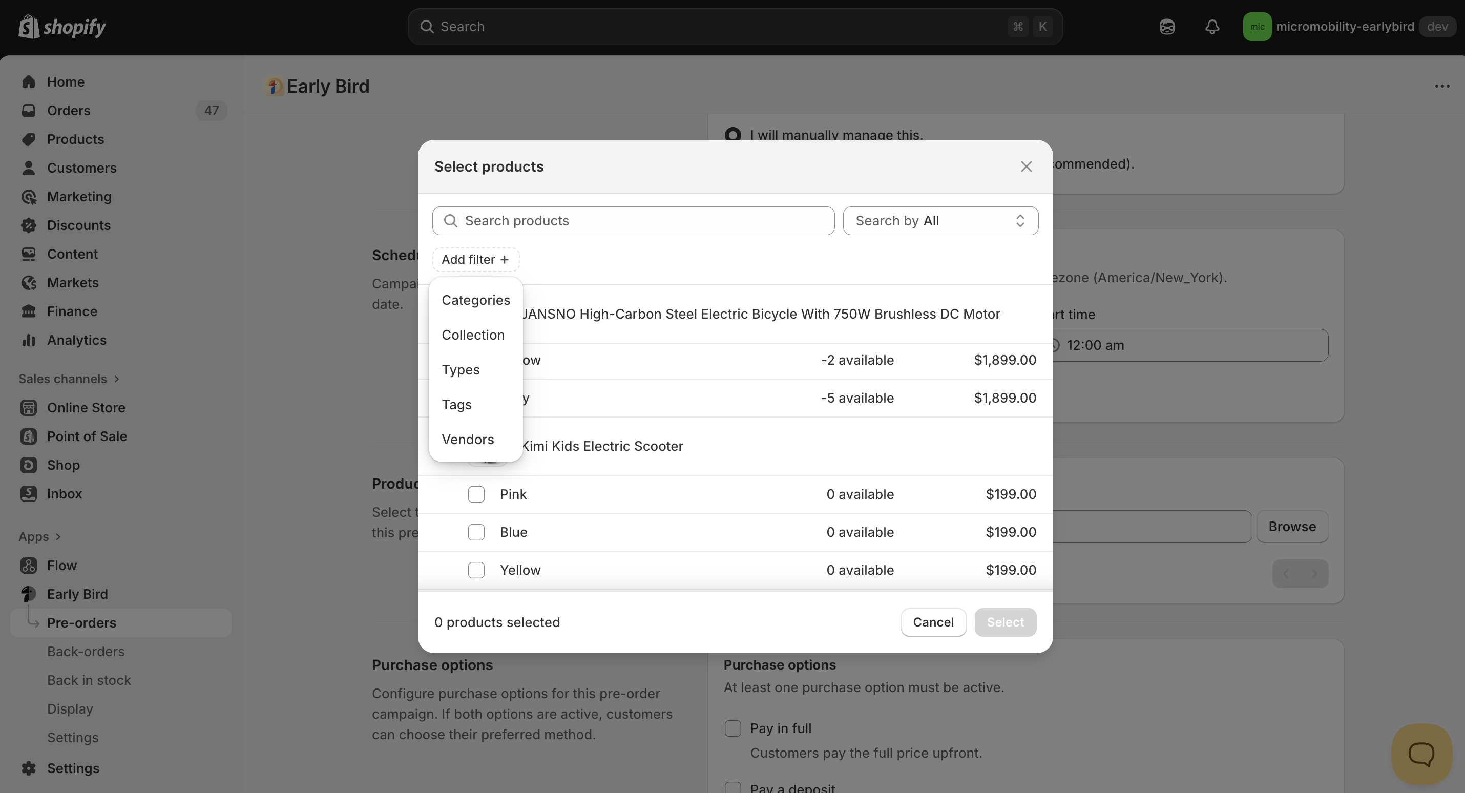 You cannot bulk import products directly into pre-order campaigns. However, you can enter product tags in the "Tags" column of your spreadsheet during your Shopify import process to organize products. Then use those tags to filter and select products for pre-orders in Early Bird.