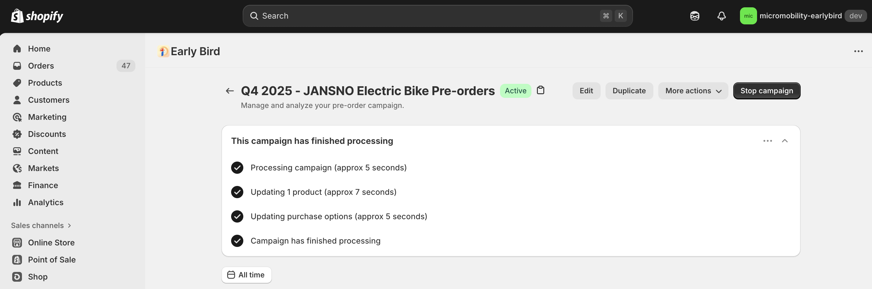 Shopify has enforced limits on pre-orders, so our campaigns can only support 250 products at a time.